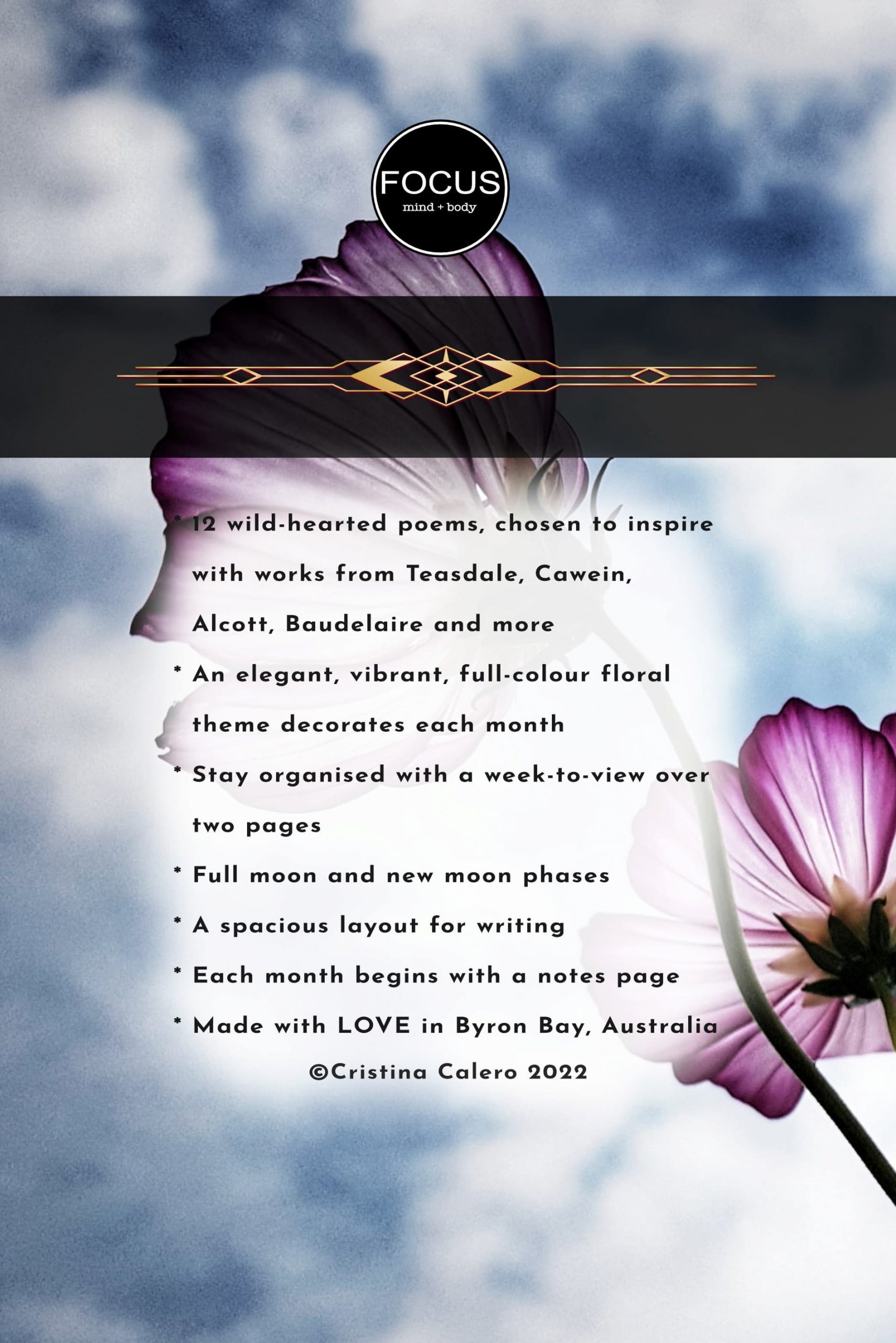 This 6in X 9in full-colour, lined diary features 12 wild-hearted poems which have been lovingly chosen with an intention to inspire, delight, and transcend everyday life. 2023’s DIARY showcases the beautiful words of Sara Teasdale, Madison Julius Cawein (twice… because his work is just soooo wonderful!), Charles Baudelaire, Toru Dutt, Louisa May Alcott, Cristina Calero, Ella Wheeler Wilcox, Richard Le Galliene, Violet Jacob, John Charles McNeill, and Emma Lazarus. As much as I love to write my own songs and poems, the sheer joy and heart-expanding thrill I get from diving into the works of the poets featured is just indescribable. This really is a labour of LOVE! A labour of JOY! A labour of wanting to SHARE these works and these stunning photographs with the world.