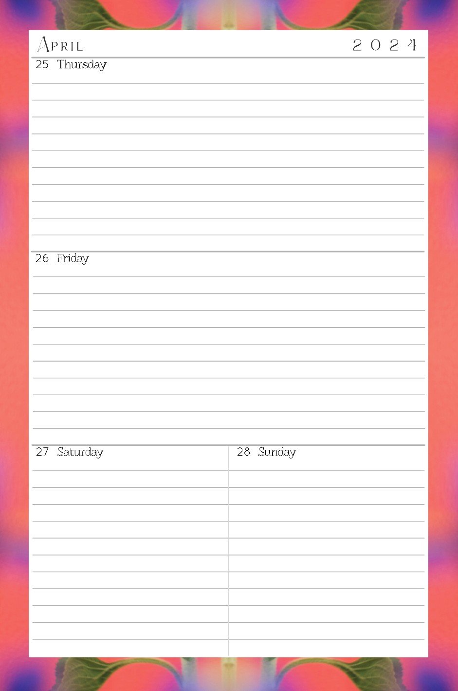 * Fully lined week-to-view diary entry pages that are spread over two pages