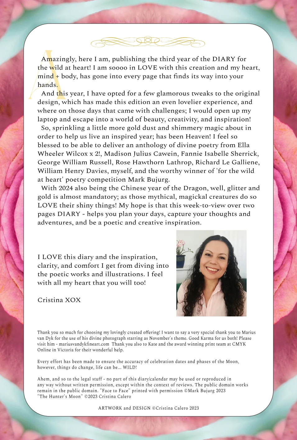 I just received my 2024 diary for the wild at heart. It’s even more glorious than 2023. The presentation and layout is gorgeous, overflowing with creativity. The poems this year are even more delightful and profound. You can feel the love that has gone into this beautiful piece of art. I love all the extra pages and special gifts. I almost don’t want to spoil it by writing in it but it makes me smile when I use it. I am gifting the diary again to the same friends and family as last year, I know they are hoping to get one again. It’s become a tradition. Thank you Cristina for sharing your passion in hard copy.